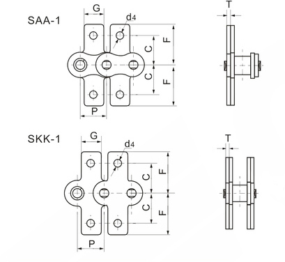 | DIN/ISO Chain No. | ANSI Chain No. | Pitch | G | C | F | d4 | |